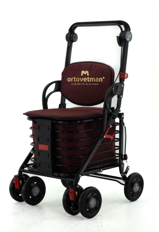 Carrito Relax. Cuatro ruedas, asiento y respaldo acolchados. Freno de mano y sistema de seguridad automático al sentarse. Asa regulable en altura. Plegable y ligero (7 kg). Capacidad de carga hasta 120 kg. Bolsa extraíble para compras. Estructura de acero y materiales resistentes. Clasificado como dispositivo médico de Clase I. Garantía de 6 meses. Ideal para paseos y compras sin cargar peso.